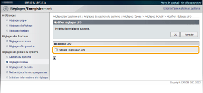 Cochez la case pour imprimer à l'aide du protocole LPD. Décochez la case si vous ne souhaitez pas utiliser le protocole LPD. [Utiliser impression RAW]