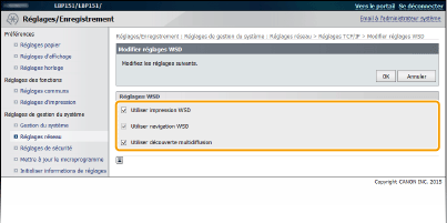 Cochez la case pour obtenir des informations sur l'appareil à partir d'un ordinateur via WSD. Cette case est automatiquement cochée lorsque la case [Utiliser impression WSD] est cochée. [Utiliser découverte multidiffusion]