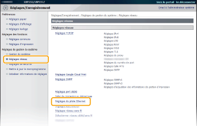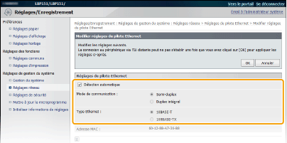 Ethernet est une norme pour la communication des données dans un réseau. Vous pouvez définir le mode de communication (Semi-duplex/Duplex intégral) et le type d'Ethernet (10BASE-T/100BASE-TX). Le réglage par défaut d'usine, le mode de communication et le type d'Ethernet sont automatiquement détectés. Généralement, les réglages Ethernet peuvent être utilisés tel quel, mais vous pouvez aussi procéder comme suit pour configurer manuellement ces réglages.