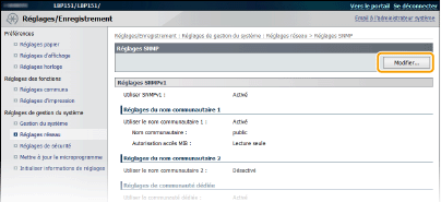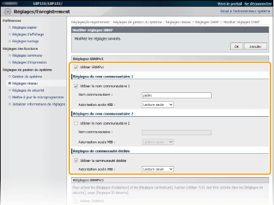 Si les deux versions du protocole SNMP sont activées en même temps, il est recommandé de définir le droit d'accès MIB pour SNMPv1 sur [Lecture seule]. Il est possible de définir différemment les droit d'accès MIB pour les protocoles SNMPv1 et SNMPv3 (ainsi que pour chaque utilisateur dans SNMPv3). Sélectionner [Lecture/Écriture] (tous les droits d'accès) dans SNMPv1 annule les puissantes fonctions de sécurité qui caractérisent SNMPv3, car la plupart des réglages de l'appareil sont alors contrôlés par SNMPv1.