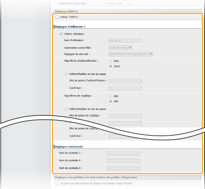 Grâce à SNMPv3, vous pouvez mettre en œuvre une gestion des périphériques réseau protégée par de puissantes fonctions de sécurité. Utilisez l'interface utilisateur distante pour effectuer les réglages après avoir activé le mode TLS (