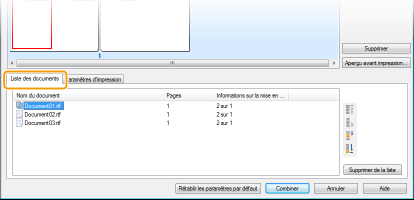 Dans la liste [Nom du document], sélectionnez la tâche d'impression combinant les documents et cliquez sur