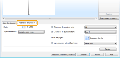 Cliquez sur l'onglet [Paramètres d'impression] pour afficher l'écran destiné à effectuer les différents réglages pour l'impression tels que le nombre de copies ou l'impression recto/recto-verso. Les réglages spécifiés à ce stade concernent l'intégralité de la tâche d'impression.