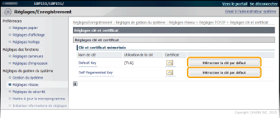 Vous pouvez chiffrer la communication entre l'appareil et un navigateur Web sur l'ordinateur à l'aide de Transport Layer Security (TLS). TLS est un mécanisme de chiffrement des données envoyées ou reçues sur le réseau. TLS doit être activé lorsque l'interface utilisateur distante est utilisée pour spécifier des paramètres pour l'authentification IEEE 802.1X (TTLS/PEAP) ou SNMPv3. Pour utiliser TLS pour l'interface utilisateur distante, vous devez définir une paire de clés et activer la fonction TLS. Générez et installez la paire de clés pour TLS avant d'activer TLS (