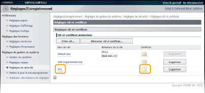 Il est impossible de supprimer une paire de clés si elle est actuellement utilisée, notamment lorsque [TLS] ou [IEEE 802.1X] est affichée dans [Utilisation de la clé]. Dans ce cas, désactivez la fonction ou remplacez la paire de clés avant de la supprimer. Les certificats préinstallés des autorités de certifications ne peuvent pas être supprimés.