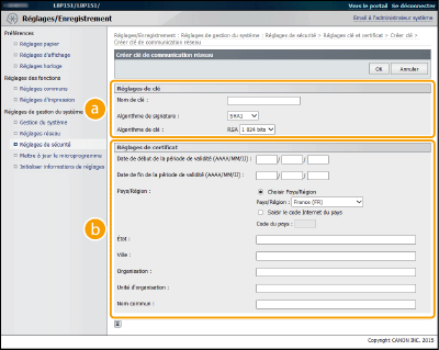 Il est possible de générer une paire de clés avec l'appareil lorsque cela est nécessaire pour une communication cryptée via Transport Layer Security (TLS). Ou pouvez utiliser TLS lorsque vous accédez à l'appareil via l'interface utilisateur distante. Il est possible d'enregistrer jusqu'à cinq paires de clés, y compris les paires de clés préinstallées. Des certificats auto signés sont utilisés avec les paires de clés générées dans "Communication réseau". Avec une "Demande de clé et de signature de certificat (CSR)", vous pouvez demander un certificat numérique émis par une autorité de certification pour la paire de clés générées par l'appareil.