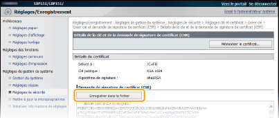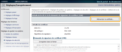 Vous ne pouvez pas utiliser la paire de clés générées par la demande de signature de certificat (CSR) tant que le certificat n'est pas enregistré. Une fois que l'autorité de certification a émis le certificat numérique, enregistrez-le selon la procédure indiquée ci-dessous.