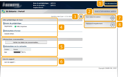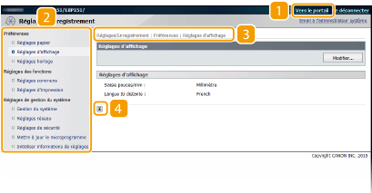 Permet d'afficher la page [Réglages/Enregistrement]. Lorsque vous êtes connecté en tant qu'administrateur système, vous pouvez modifier les réglages de l'appareil sur cette page.