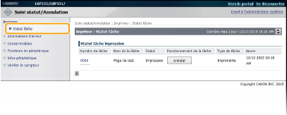 Cliquez sur [Numéro de tâche ] pour afficher les informations détaillées sur un document. Par exemple, vous pouvez vérifier le nom d'utilisateur et le nombre de pages imprimées du document.