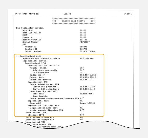 (Carta) e tenerlo premuto per 3 secondi per stampare un elenco delle impostazioni. Ciò consente di verificare le impostazioni IPv4, l'indirizzo MAC e le impostazioni LAN cablata/wireless. L'elenco delle impostazioni è impostato per la stampa su carta di formato A4. Prima di stampare, caricare carta A4 nel cassetto della carta. Caricamento della carta nel cassetto