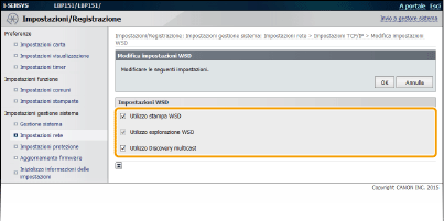 Selezionare la casella di controllo per ottenere informazioni sulla macchina da un computer tramite WSD. Questa casella di controllo viene selezionata automaticamente quando si seleziona la casella di controllo [Utilizzo stampa WSD]. [Utilizzo Discovery multicast]
