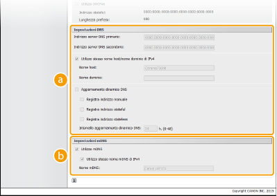 Selezionare la casella di controllo per utilizzare le stesse impostazioni in IPv4. Deselezionare la casella di controllo e specificare un nome in [Nome mDNS] se si desidera utilizzare impostazioni diverse da IPv4. |