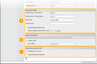 Selezionare la casella di controllo per aggiornare automaticamente i record DNS qualora cambi l'associazione tra l'indirizzo IP della macchina e il relativo nome host (es. in un ambiente DHCP). Per specificare l'intervallo tra gli aggiornamenti, inserire il tempo in ore nella casella di testo [Intervallo aggiornamento dinamico DNS]. Disattivare la casella di selezione se non si desidera usare l'aggiornamento dinamico. [Impostazioni mDNS][Utilizzo mDNS]
