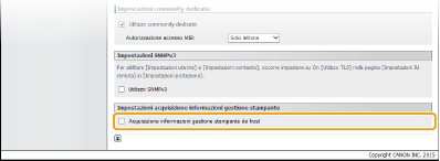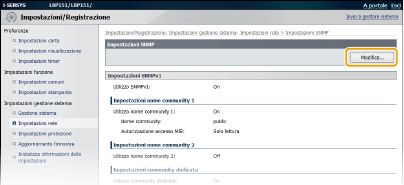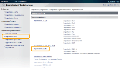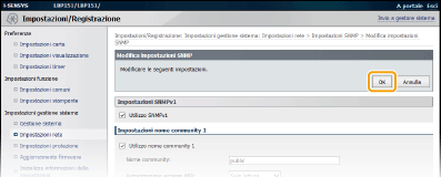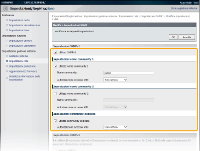 Se entrambe le versioni di SNMP sono disabilitate, alcune funzioni della macchina non saranno disponibili, come il conseguimento di informazioni sulla macchina tramite il driver di stampa.