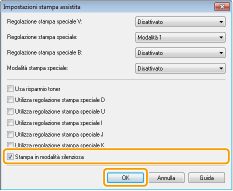 ![]() Stampa silenziosaSe il rumore della stampa è un problema, è possibile ridurlo impostando la modalità silenziosa. Tenere presente che, stampando in modalità silenziosa, la stampa diventa più lenta.