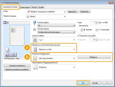 Se occorre rilegare il documento stampato con una cucitrice o strumento simile, specificare la posizione della rilegatura sulla stampa. L'orientamento di stampa cambierà in base alla posizione di rilegatura specificata. Per specificare la larghezza del margine per la posizione di rilegatura, fare clic su [Rilegatura].