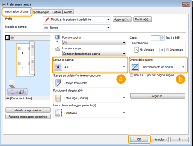 È possibile stampare più pagine su un singolo foglio. Ad esempio, è possibile stampare da quattro a nove pagine su un foglio con l'opzione [4 su 1] o [9 su 1]. Utilizzare questa funzione per risparmiare carta o visualizzare il documento come miniatura.
