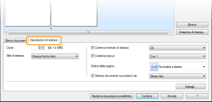 Fare clic sulla scheda [Impostazioni di stampa] per visualizzare la schermata in cui specificare le impostazioni di stampa come numero di copie o stampa su un lato/stampa fronte-retro. Le impostazioni specificate qui vengono applicate all'intero lavoro di stampa.