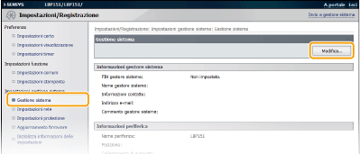Per modificare le impostazioni della macchina dalla IU remota sono necessari i diritti di accesso amministratore. Dopo aver eseguito l'accesso come amministratore, utilizzare la seguente procedura per impostare il PIN (password del gestore sistema). La password del gestore sistema è cruciale per la protezione della macchina. Assicurarsi che solo i gestori sistema conoscano la password dei gestori sistema.
