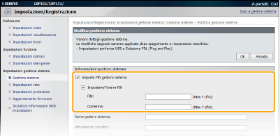 Selezionare la casella di controllo [Imposta PIN gestore sistema] e immettere il PIN.