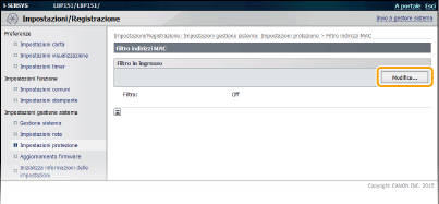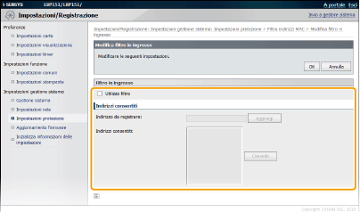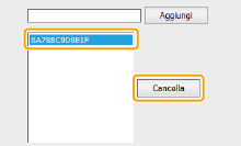 Immettere un indirizzo MAC nella casella di testo [Indirizzo da registrare] e fare clic su [Aggiungi]. Permette la comunicazione (ricevuta) solo con le periferiche il cui indirizzo MAC è stato registrato e blocca la comunicazione con le periferiche aventi qualsiasi altro indirizzo MAC.