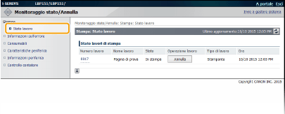 Fare clic su [Numero lavoro] per visualizzare informazioni dettagliate su un documento. Ad esempio, è possibile controllare il nome utente e il numero di pagine del documento.