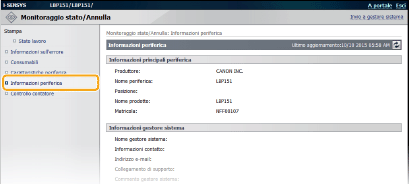 Questa pagina visualizza informazioni sulla macchina e sul gestore del sistema. Queste informazioni vengono impostate in [Gestione sistema] nella pagina [Impostazioni/Registrazione] (