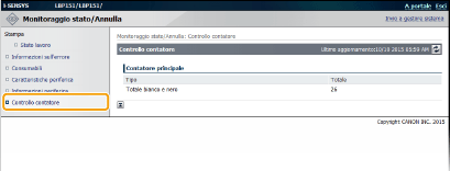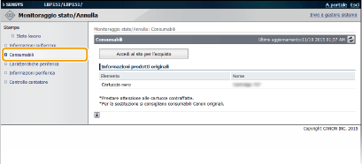 Sono visualizzati il numero di modello della cartuccia e altre informazioni. È possibile anche fare clic su [Verifica dettagli consumabili] nella Pagina portale (pagina principale) per visualizzare la schermata di controllo dei materiali di consumo.