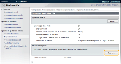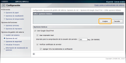 Deberá habilitar Google Cloud Print. Haga clic en [Editar], seleccione la casilla de verificación [Usar Google Cloud Print] y, a continuación, haga clic en [Correcto].