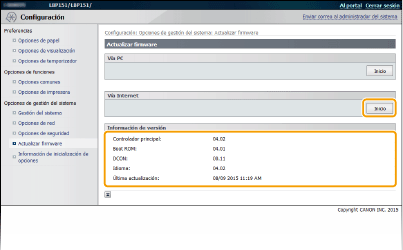 Inicie una sesión en la IU remota (Inicio del IU remoto [Configuración]  [Actualizar firmware]  [Inicio] en [Vía PC]  [Correcto]