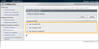 Marque la casilla de verificación para obtener información sobre el equipo desde un ordenador a través de WSD. Esta casilla de verificación se selecciona automáticamente cuando se marca la casilla de verificación [Usar impresión WSD].