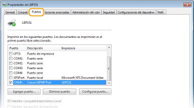 Podrá añadir un puerto MFNP únicamente si ha instalado el controlador de impresora desde el DVD-ROM suministrado, o si se descargó e instaló el controlador de impresora desde el sitio web de Canon.