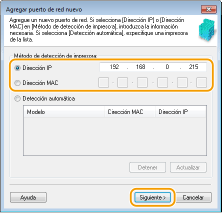 Este puerto permite que la dirección IP del equipo sea detectada automáticamente. Aun en el caso de que la dirección IP del equipo cambie, la conexión se mantendrá, ya que el equipo y el ordenador tienen la misma subred. Por tanto, no tendrá que añadir un puerto nuevo cada vez que cambie la dirección IP. Si está utilizando el equipo en un entorno IPv4, lo normal es que seleccione este tipo de puerto.