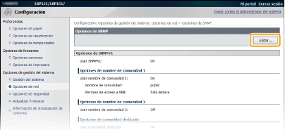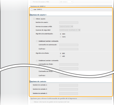 Protocolo simple de administración de redes (SNMP) es un protocolo para supervisar y controlar los dispositivos de comunicación de una red utilizando una Base de datos de información de administración (MIB). El equipo admite SNMPv1 y SNMPv3 con seguridad mejorada. Estos le permitirán consultar el estado del equipo desde un ordenador al imprimir documentos o al utilizar el IU remoto. Puede activar SNMPv1 o SNMPv3, o ambos al mismo tiempo. Especifique las opciones de cada versión según su entorno de red y el uso previsto.
