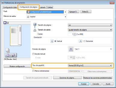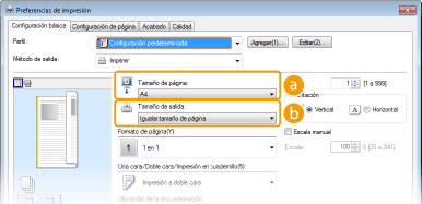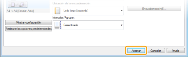 Podrá especificar de forma sencilla el diseño de las páginas, la posición de encuadernación, etc. de forma intuitiva en la imagen de vista preliminar. Para obtener más información, haga clic en [Ayuda] en la pantalla del controlador de impresora.