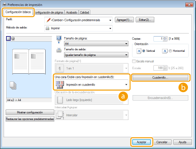 Seleccione [Impresión en cuadernillo] en [Una cara/Doble cara/Impresión en cuadernillo]