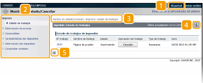 Muestra la página [Monitor de estado/Cancelar]. Puede utilizar esta página para consultar el estado de impresión actual, para cancelar el proceso de impresión y para ver un historial de los trabajos de impresión.
