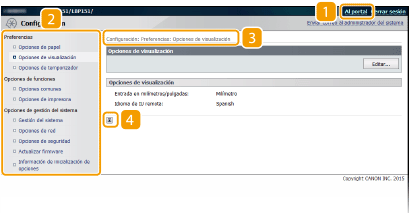 Muestra la página [Configuración]. Si inicia una sesión en modo de administrador de sistema, puede utilizar esta página para cambiar la configuración del equipo.