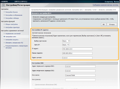Выберите [Выкл.] для [Выбор протокола] и [Авто IP].