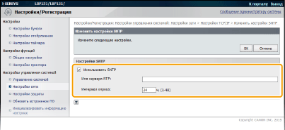 Проверка связи с сервером NTP/SNTPМожно протестировать обмен данными между аппаратом и зарегистрированным сервером времени. Щелкните [Настройки/Регистрация]