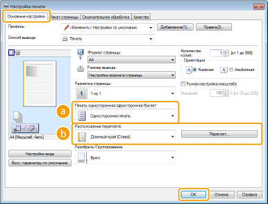 Выберите [Односторонняя печать] или [Двухсторонняя печать] в пункте [Печать односторонняя/двухсторонняя/буклет]
