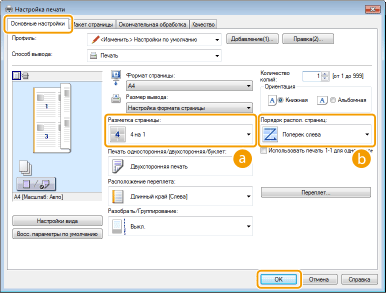 Можно расположить несколько страниц на одном листе. Например, вы можете напечатать четыре или девять страниц на одном листе, используя параметры [4 на 1] или [9 на 1]. Используйте эту функцию для экономии бумаги или просмотра миниатюры документа.
