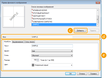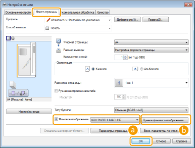 Щелкните каждую вкладку, чтобы указать текст, цвет и расположение водяного знака. Дополнительные сведения см. в разделе [Справка] драйвера принтера.