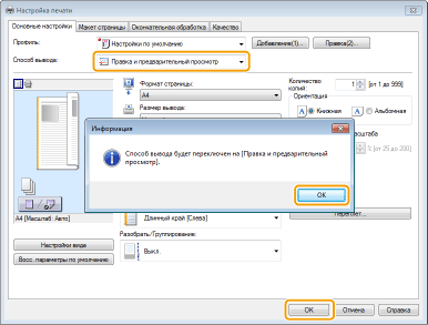 Выберите [Правка и предварительный просмотр] в пункте [Способ вывода].