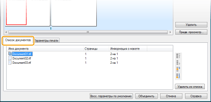 Щелкните вкладку [Список документов], чтобы отобразить документы, добавленные в ходе выполнения шагов 1–4. Удалить документы из списка можно следующим образом: выберите документ и щелкните [Информация о макете].