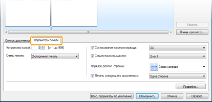 Щелкните вкладку [Параметры печати], чтобы отобразить окно настройки параметров печати, например количество копий 1-сторонней/2-сторонней печати. Заданные параметры будут применяться ко всему заданию на печать.