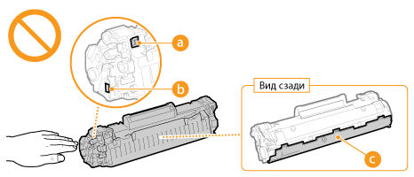 Обработка картриджа с тонеромДержите картридж с тонером за ручку.