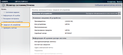 На этой странице отображаются сведения об аппарате и администраторе системы. Эти сведения можно найти в [Управление системой] на странице [Настройки/Регистрация].