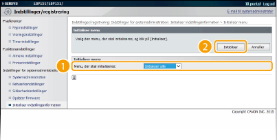 Vælg de indstillinger, der skal initialiseres, på rullelisten. Vælg [Initialiser alle] for at initialisere alle indstillingerne i [Visningsindstillinger], [Timerindstillinger], [Almene indstillinger] og [Printerindstillinger] på én gang.