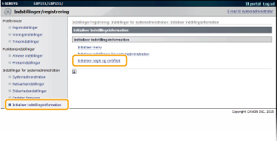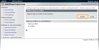 Du kan gendanne indstillingerne for nøglepar (nøgle- og certifikatindstillinger) og CA-certifikater til standardindstillingerne. Bemærk, at alle nøglepar, du har registreret i maskinen samt alle CA-certifikater (undtagen de forudindstillede CA-certifikater) slettes efter initialiseringen.